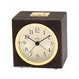 This masculine alarm clock features a faux leather case with antique gold accents. It has a snooze button which also acts as the light button for the dial. . .. . Dark brown imitation leather case . . Antique gold-tone accents . . Cream/white dial with black hands and markers . . LED dial light - this clock will light up when the snooze/light button is pressed . . Snooze function . . Ascending beep alarm . . Dimensions: 3.75" High x 3.5" Wide x 3" Deep . .