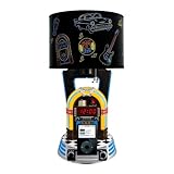 This novel 50's themed table lamp transforms your iPod into a desktop jukebox. Colored LEDs light up and hidden drawer reveals an iPod docking station which plays and charges your iPod. iPod not included. Tough ABS plastic construction. iPod docking station with alarm clock feature. Multicolor LED lights. Takes one 60 watt bulb (not included). 18" high. Shade is 10 3/4" across and 7 1/2" high.